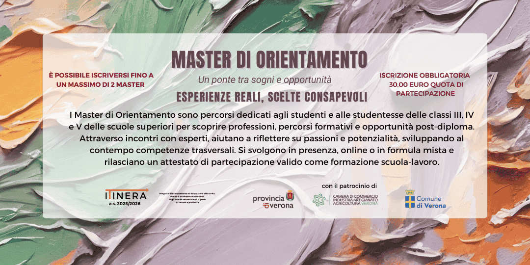 I Master di Orientamento sono percorsi formativi esperienziali, strutturati in 5 incontri pomeridiani dalle ore 15.30 alle 17.30, dedicati alle classi III, IV e V delle scuole superiori. Questi percorsi non si limitano a lezioni tradizionali, ma offrono: