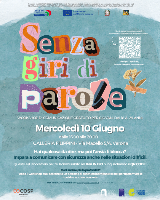 “Senza giri di parole” è un laboratorio pratico dedicato a giovani tra i 19 e i 28 anni che vogliono migliorare il proprio modo di comunicare in università, nei colloqui di lavoro e nelle relazioni professionali.