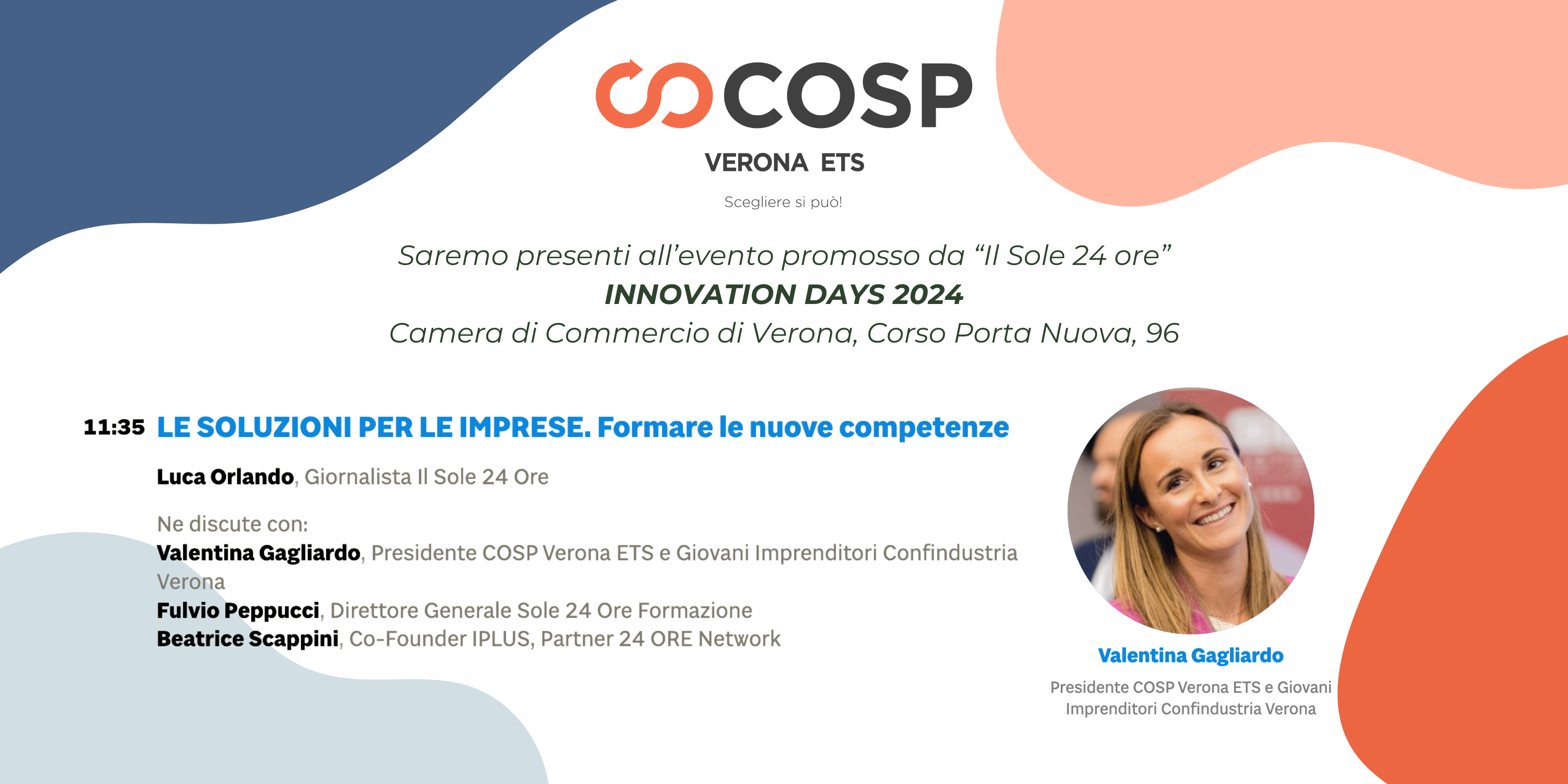 Il 24 settembre 2024, COSP Verona ETS parteciperà all'Innovation Days 2024, un evento di grande rilevanza organizzato da Il Sole 24 Ore, che si terrà presso la Camera di Commercio di Verona. Questo appuntamento rappresenta una straordinaria occasione per discutere delle sfide del futuro in termini di innovazione, industria 5.0, transizione ecologica e sostenibilità.