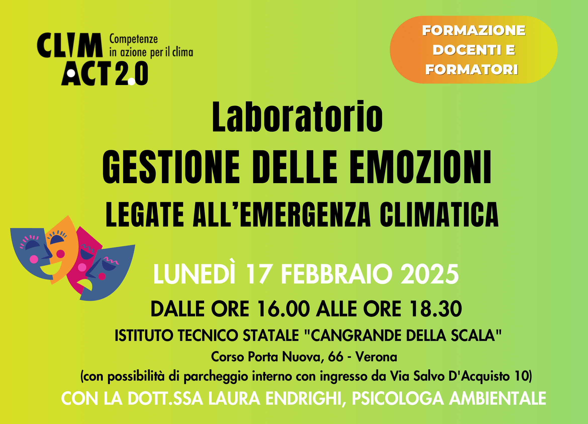 Per rispondere a queste esigenze, l'Associazione Rete Verso, all'interno del progetto ClimAct - Competenze in azione per il clima, dove partecipa anche COSP Verona ETS, propone il laboratorio gratuito “Gestione delle emozioni legate all’emergenza climatica”. Il laboratorio, condotto dalla psicologa ambientale Laura Endrighi, mira a fornire competenze pratiche per gestire l'eco-ansia negli studenti.