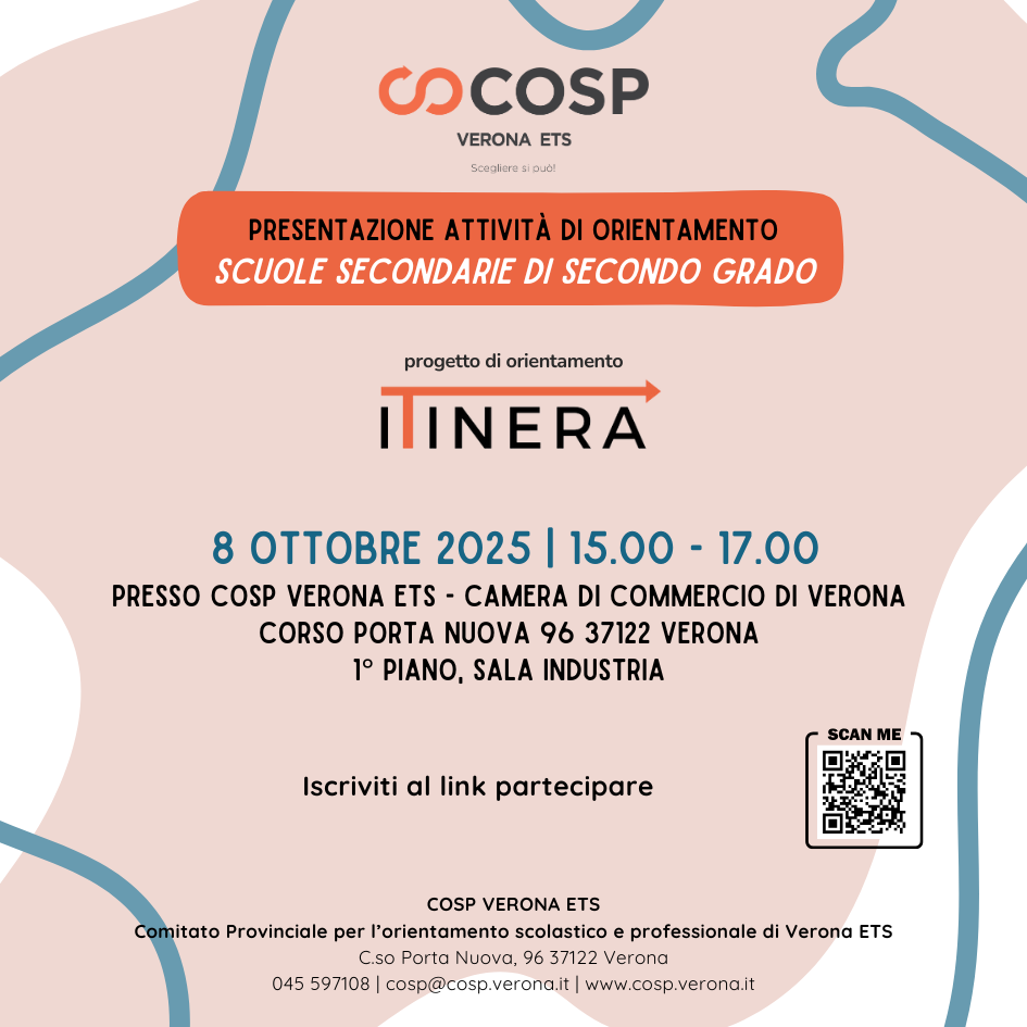COSP Verona ETS rinnova il proprio impegno a supporto delle scuole e delle famiglie con due incontri dedicati alla presentazione delle attività di orientamento per l’anno scolastico 2025/2026.